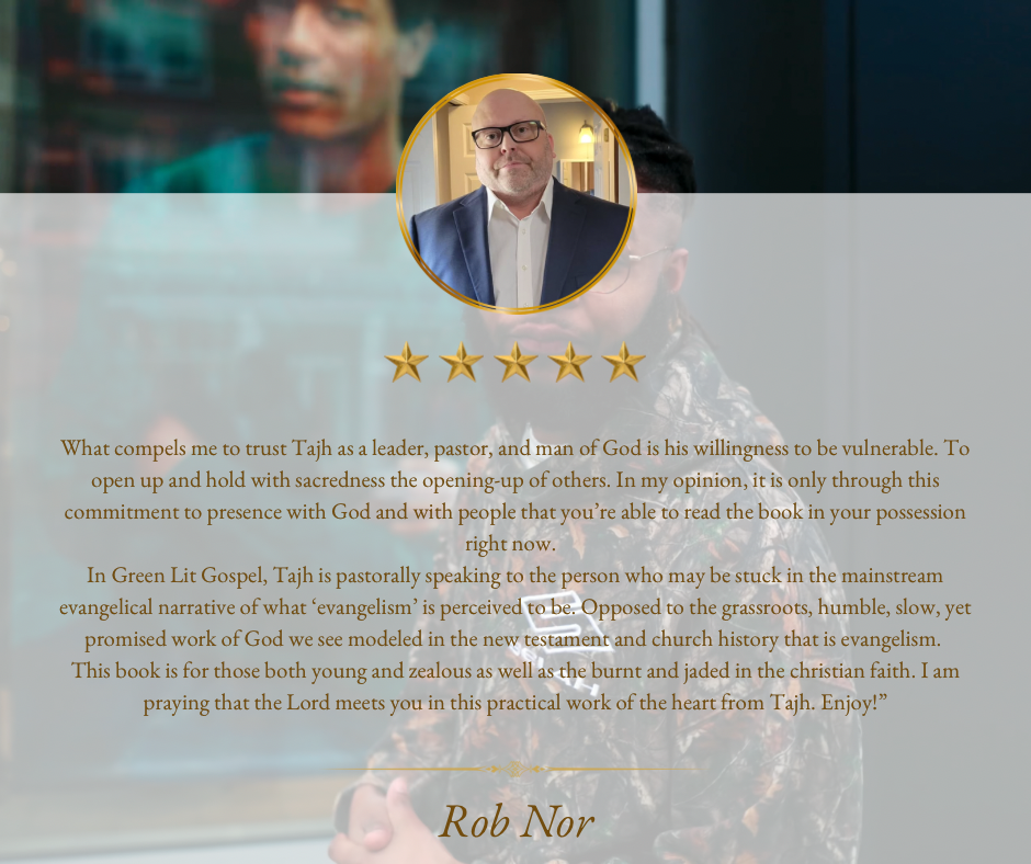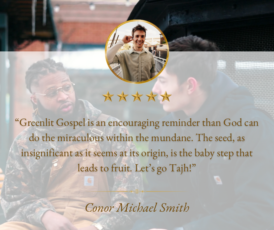 In Greenlit Gospel, Tajh’s heart is simple: to encourage believers to share their faith without fear or discouragement, and to nudge unbelievers toward the possibility that maybe now is their moment to say yes to the God who has been pursuing them all along.
